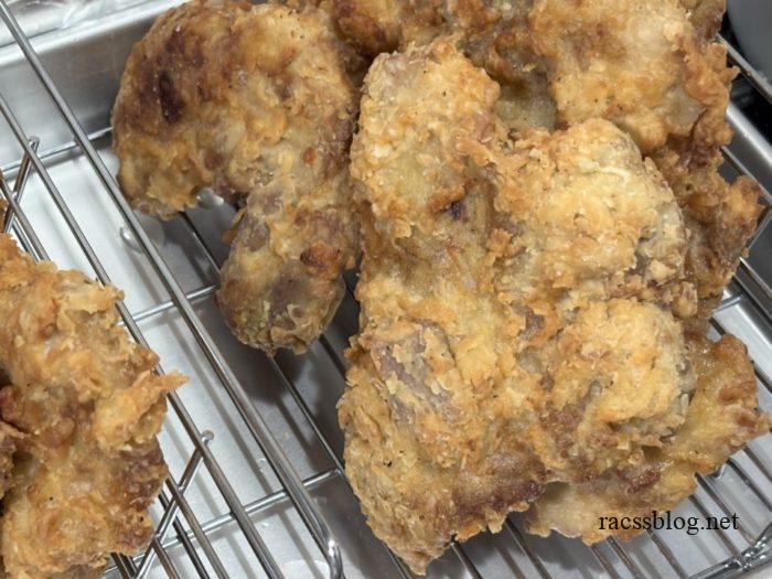 これでビッグサイズでインパクトのあるフライドチキンも安心。4キロの鶏もも肉で20人分のフライドチキン、たっぷりできました。