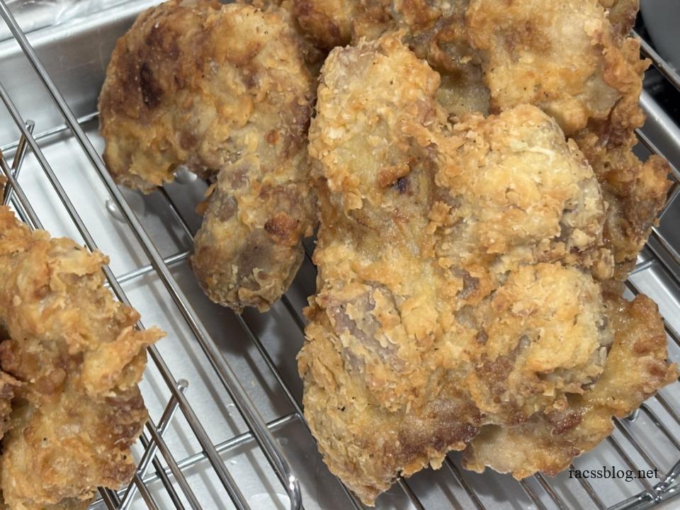 フライドチキンや唐揚げって、中まで火が通ったか心配ですよね。衣がいい色になったから上げると芯はまだ赤かったりする。特に大量に作るときは時間もかかるし大変なんですが、先に下茹でしておく方法でやったらうまくいきました。