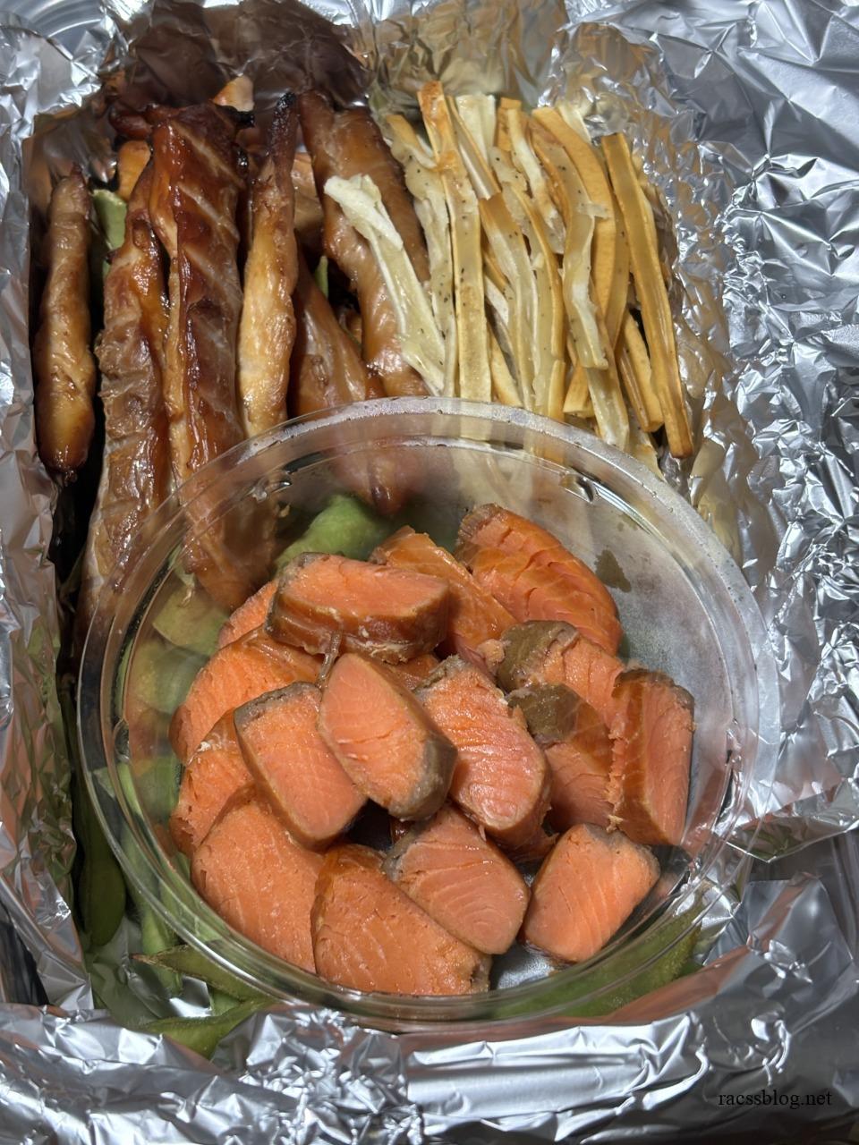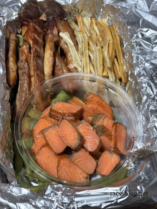 さっそく試してみたのが、スモークサーモンとササミジャーキー。 友人との飲み会に持っていきたいからと、夫主導で初使用です。ついでにチータラと枝豆も一緒に燻してみたら、これがまたいい仕上がりでした。