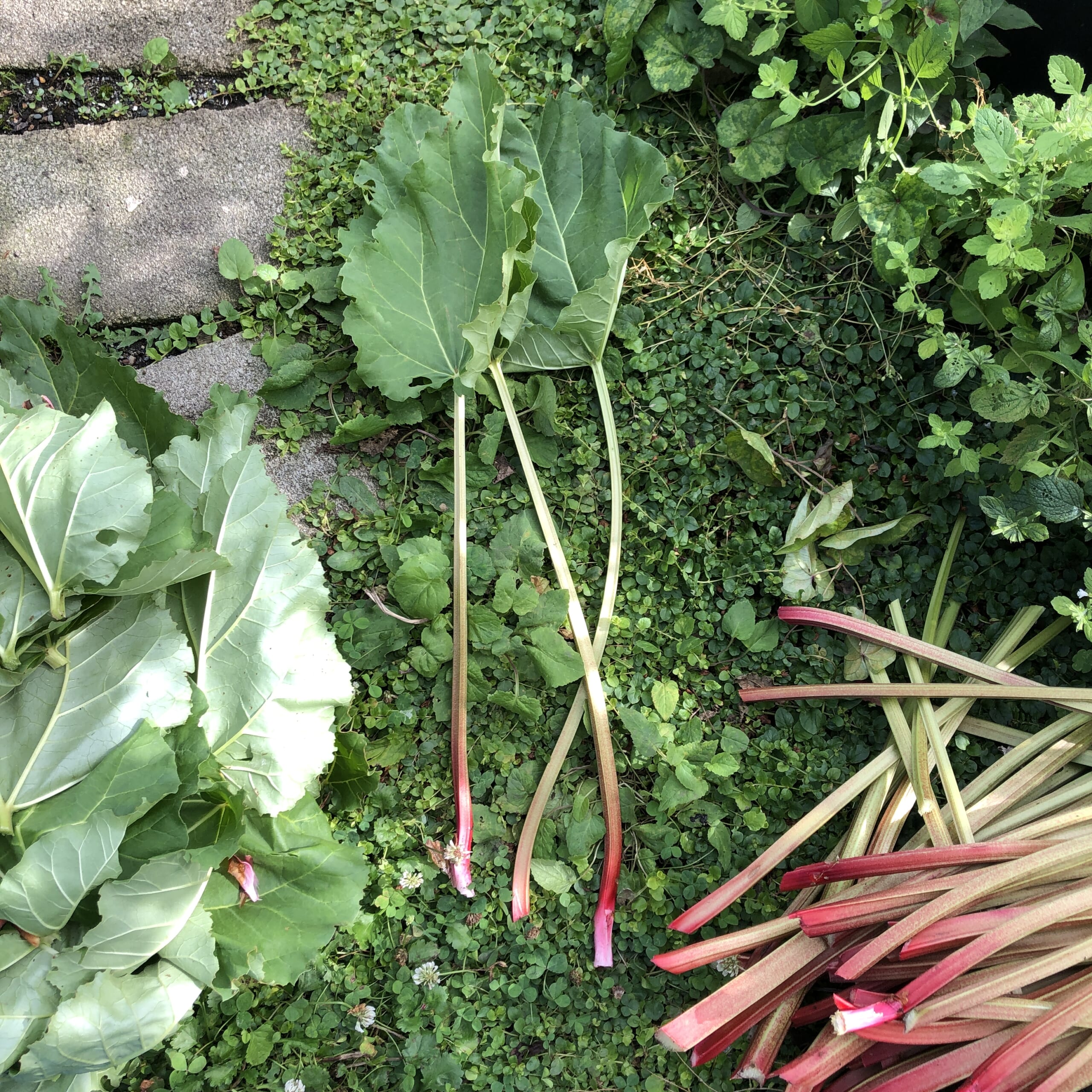 ルバーブは大きな葉っぱがついて長い柄なので、見た目はフキみたいな感じ。でも中心に穴は空いていません。