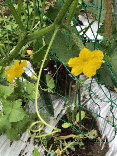 きゅうりは今のところ元気いっぱい。強健豊作の名の通り、たくさん実をつけています。