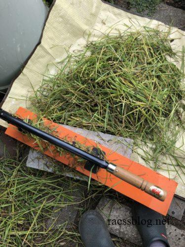 押し切りでザクザク切ったのはボランティアで草刈りをした先からもらってきたもの。イネ科の長ーい草です。これを昨年から年1度か2度草刈りするときにもらってきて、畑に敷いています。