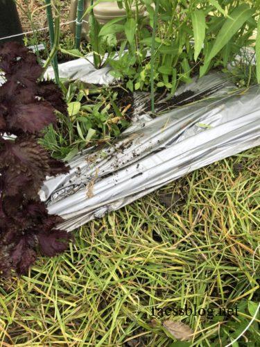 春先からビニールマルチで地温を上げていたのがピーマン畝と大玉トマト苗。透明マルチなのでこの時期はもう熱くなりすぎます。触ったら熱っ!てなるくらいなので、ビニールは外して草マルチに切り替えました。