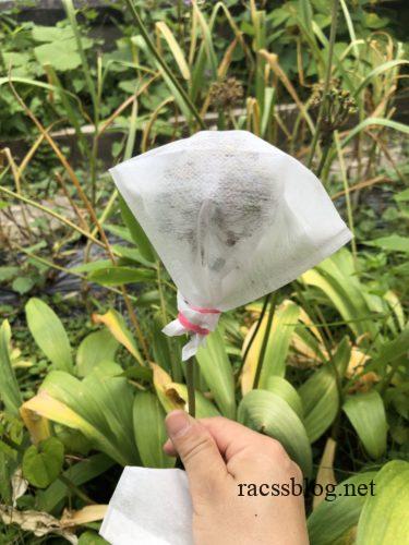 行者にんにくの花がたくさんついたので、種取りをするために袋をかぶせています。だしパックの不織布の袋が手に入りやすく便利です。
